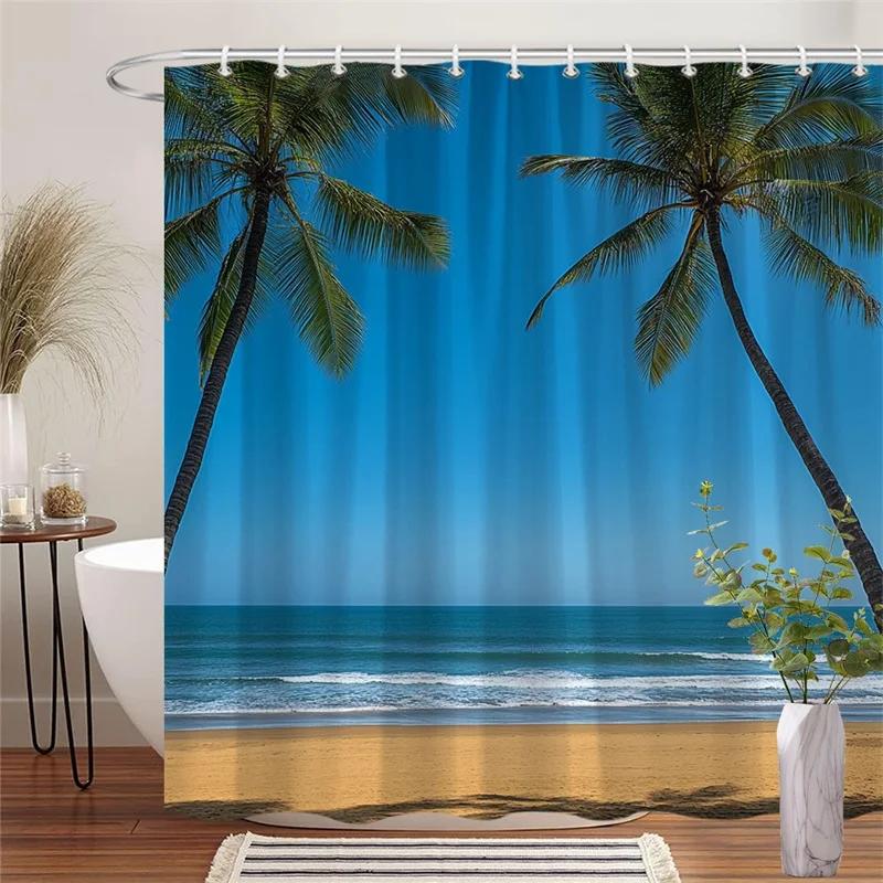 1pc Tropical Beach Scene Shower Curtain - Polyester, Machine Washable, 70.86x70.86in, 12 Hooks, Tranquil Palm Trees & Ocean View
