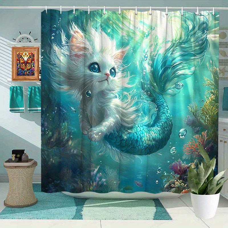 1pc Mermaid Kitten Shower Curtain - Ocean Scene, Fluffy White Cat, Colorful Coral, Polyester,12 Hooks, Enchanting Design