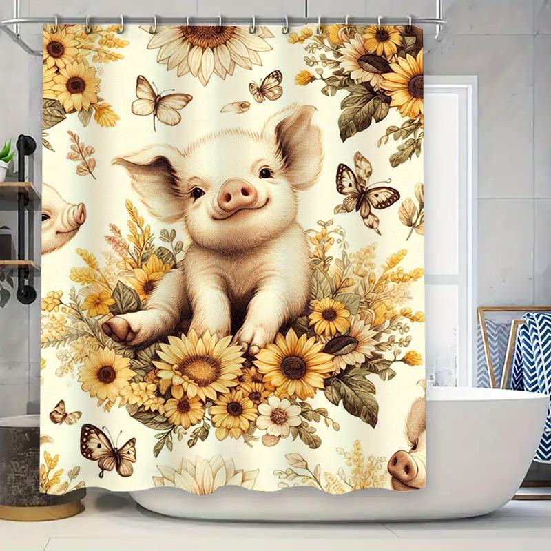 Sunflower Shower Curtain Rustic Farmhouse Decor Toned Pig Bath Mat Set for Bathroom Decoration