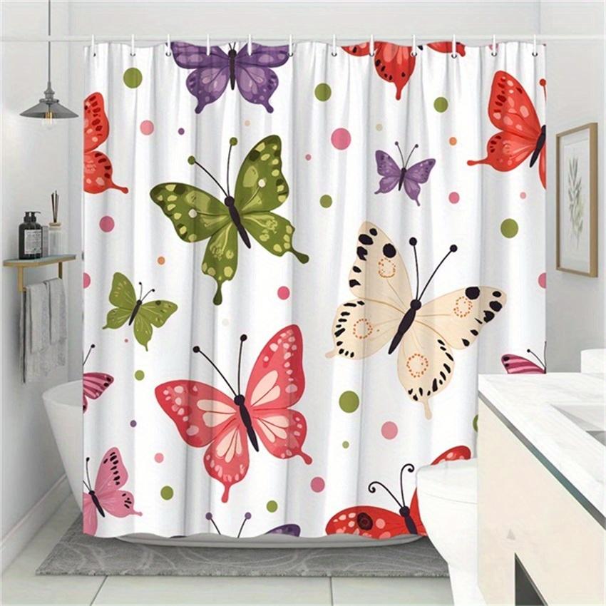 Colorful Butterfly & Polka Dot Shower Curtain - Playful Design, 12 Hooks, Vibrant Butterflies on White, Polyester, Easy to Clean