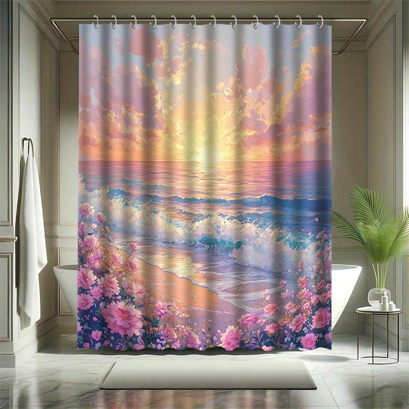 Fantasy Beauty Shower Curtain Set - Beach Waves & Flowers, White Clouds & Sunrise, Polyester Fabric, Modern Bathroom Decor