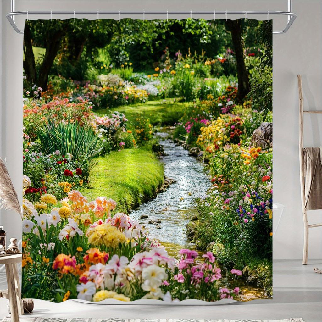 Lush Garden Stream Shower Curtain - Tranquil Nature Scene with Colorful Flowers, Polyester Woven,Machine Washable,Bathroom Decor