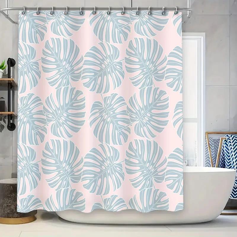 Modern Monstera Leaf Pattern Waterproof Shower Curtain Set for Bathroom Decor Light Pink Blue Colors Available in Various Sizes