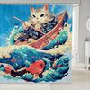 Cartoon Cat Shower Curtain,Japanese Ukiyo Painting Waves Sunrise Bathroom Curtain Kids Teens Women Room Decor,Ocean Waterproof