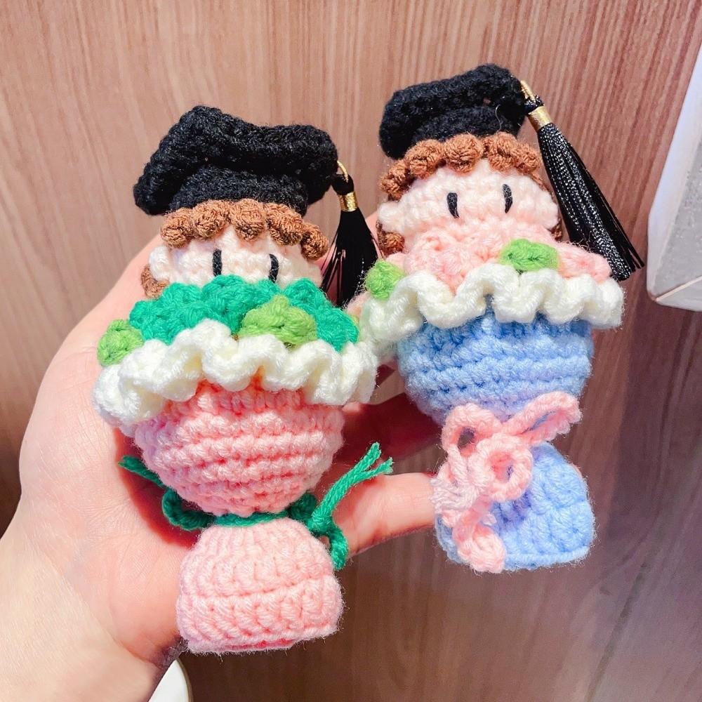 Funny Crochet Bouquet 13cm Doctor Hat Bouquet Doll Handmade Knitted Figures Graduation Gift