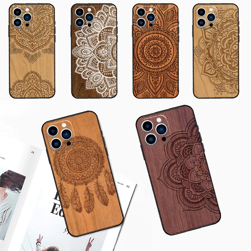 Mandala Floral Wood Phone Case For iPhone 17 Pro Max 11 14 15 16 Pro Max Plus 13 12 Mini 16e 17 Air Back Cover