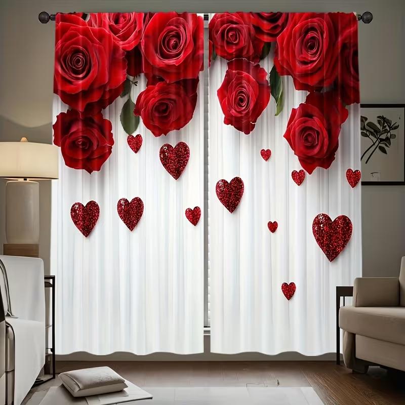 2PC Red Rose Glitter Heart Sheer Curtains - Romantic Valentine's Themed Print Window Drapes for Bedroom Living Room Decor