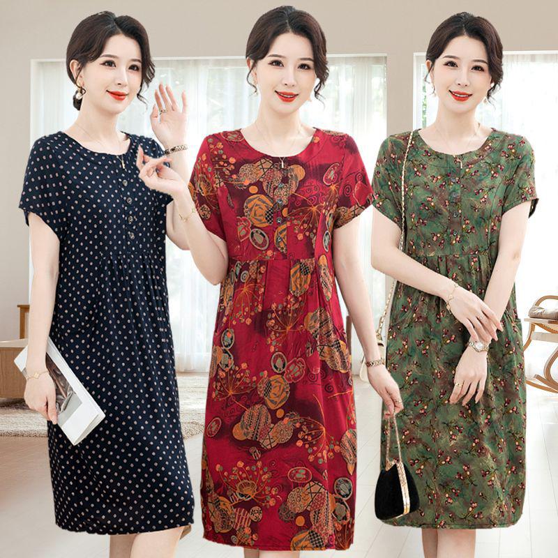Introducing a stylish and comfortable knee-length dress designed specifically for moms. This dress is crafted from a soft cotton-silk blend, offering a luxurious feel against the skin. It features a loose fit and short sleeves, making it perfect for warm summer days. The dress is made from quality materials, including knitted fabrics and nylon, ensuring durability and ease of care. Ideal for casual outings or family gatherings, this dress combines elegance with comfort, making it a wardrobe essential for women who appreciate both style and practicality.