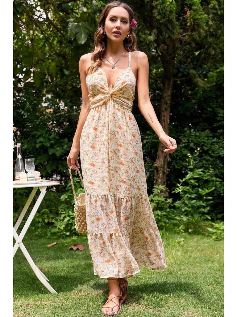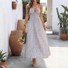 2026 Summer Elegant Floral Deep V Spaghetti Strap Dress - Women's Waist-Cinching Wide Hem for Holiday Style