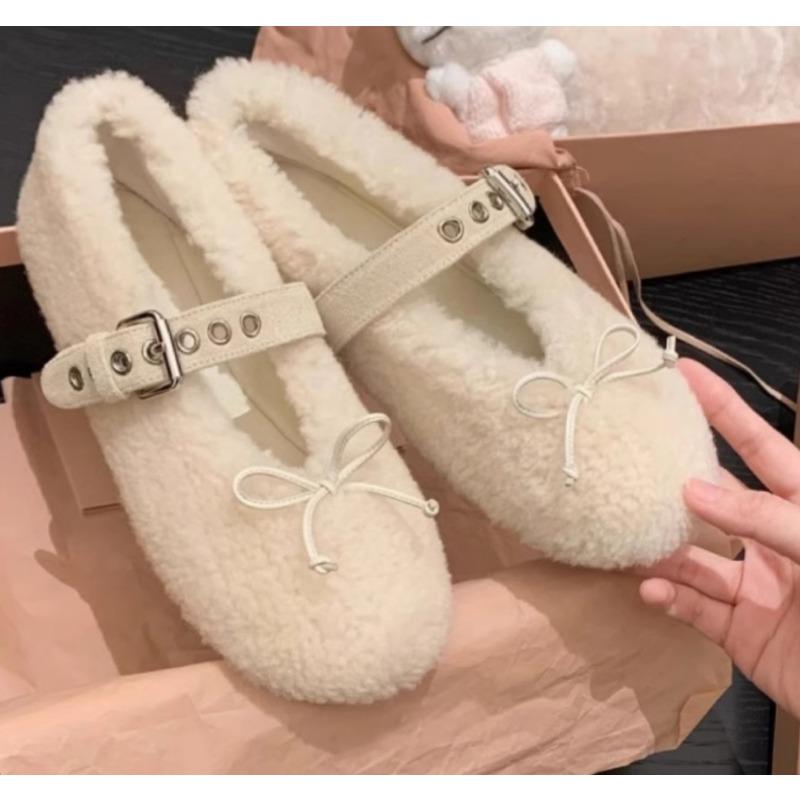 Winter New Warm Fur Flat Shoes Women's Fashion Round Head Butterfly Rivets Soft Sole Shoes Non-slip Plush Mary Jane Shoes
