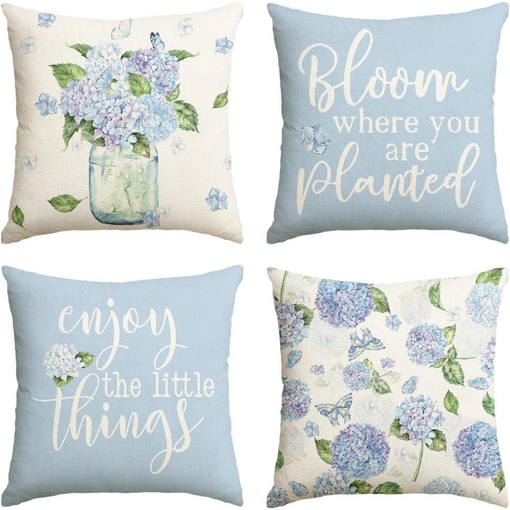 4pcs Spring Bloom Where You Are Planted Hydrangea Vase Throw Pillow Covers Enjoy The Little Things Blue Summer Cushion Case Decoration