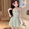 Summer French Bow Strap A-line Dress for Women - Blue Multi-wear Short Skirt