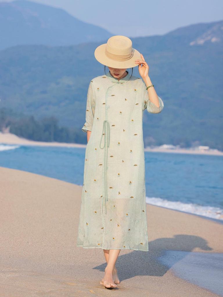 Embrace elegance and comfort with this exquisite summer dress crafted from a soft hemp blend. Featuring a sophisticated stand collar and mid-length sleeves, this dress showcases intricate embroidery that adds a touch of traditional charm. The classic Qipao design is modernized with a subtle slit, offering an alluring silhouette perfect for warm weather. Ideal for casual outings or special occasions, its lightweight fabric ensures you stay cool and stylish all season long.