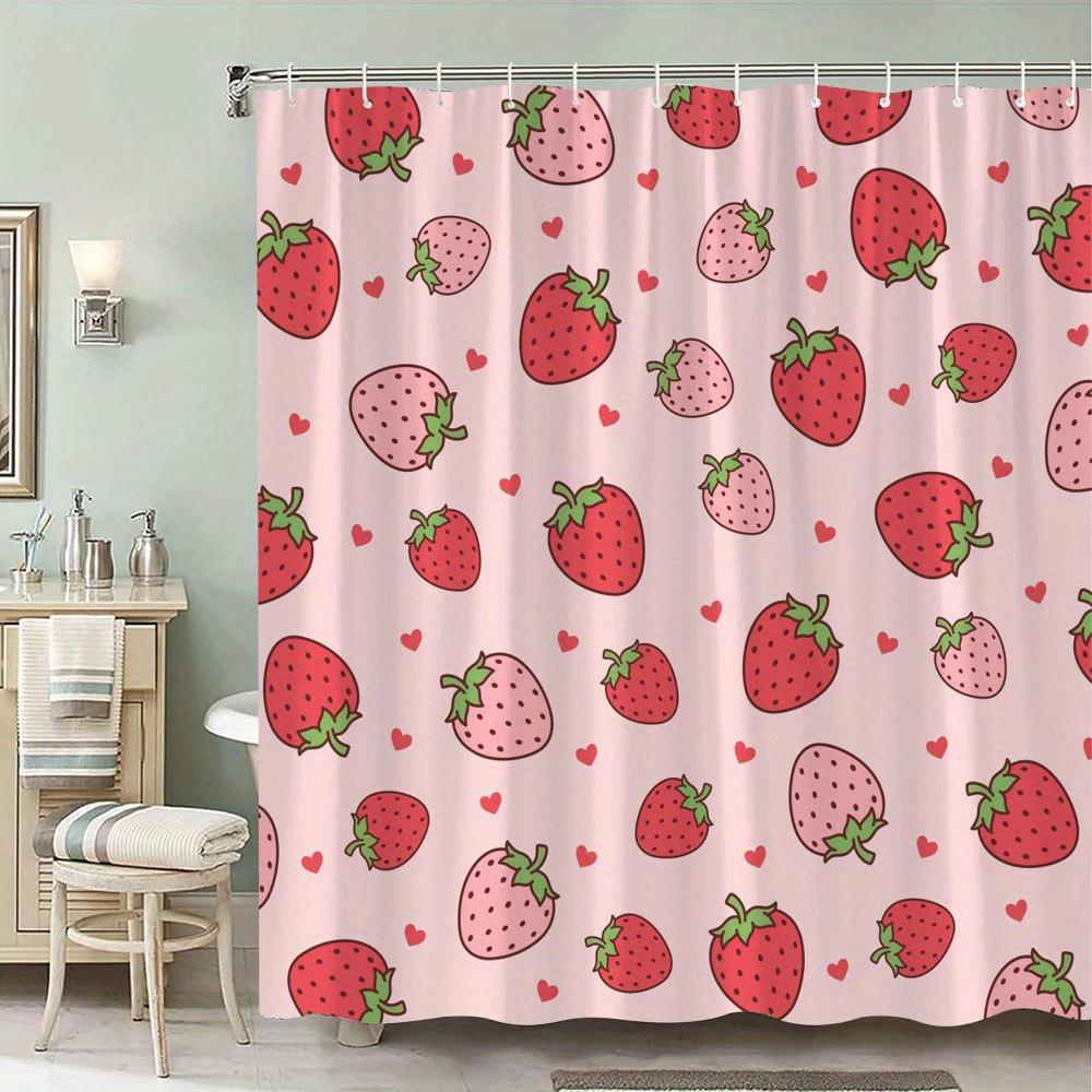 A Sweet and Whimsical Shower Curtain: Adorn Your Bathroom with This Charming Design Featuring Playful Strawberries and Hearts