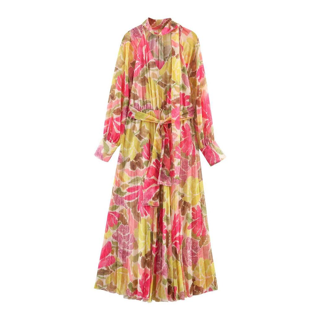 Embrace elegance and timeless charm with this dress, featuring a captivating floral print and a chic bow belt. The long sleeves and sophisticated design echo European and American style, perfect for elevating your spring wardrobe. Crafted from a blend of polyester, the dress offers a comfortable fit and lasting quality. Ideal for both casual outings and special occasions, it promises to add a touch of feminine grace to any ensemble.