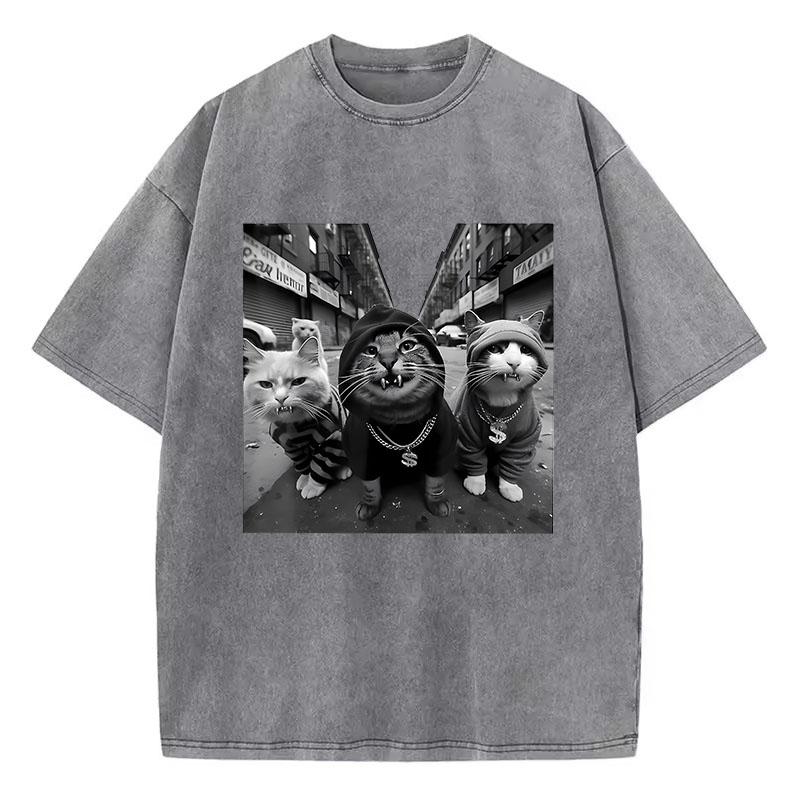 Streetwear Cat Hip Hop T Shirt Vintage Washed Cotton T-Shirt Graphic Tee Casual Streetwear Spring Summer Tee