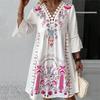 Elevate your summer wardrobe with this stylish V-neck dress designed for women. Crafted from high-quality polyester, it offers a lightweight and comfortable fit, perfect for warm days. The dress features elegant lace patchwork details, adding a touch of sophistication to its casual design. The eye-catching print enhances its trendy appeal, making it a versatile choice for various occasions, from beach outings to casual gatherings. Enjoy comfort and style with this charming summer essential.