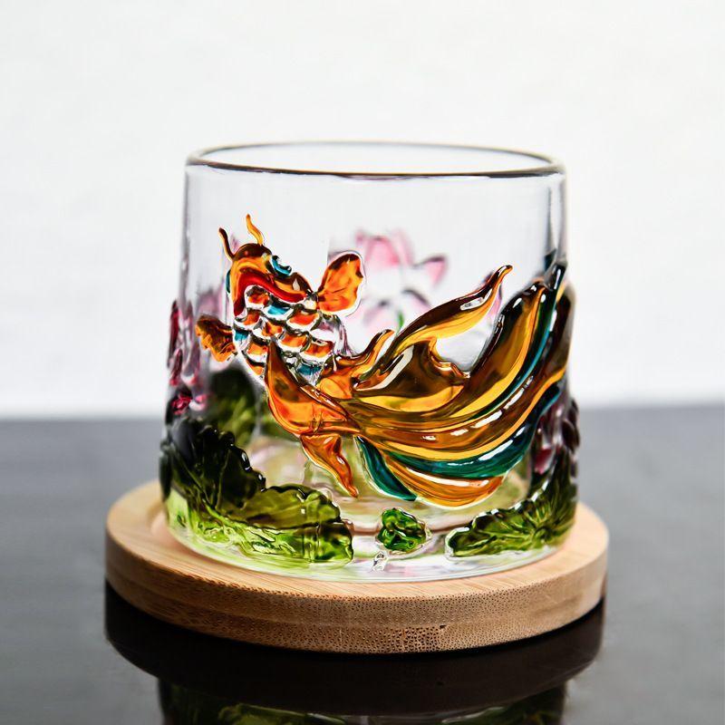 Emboss Drinkware Pressure Reducing Rotatable Mug Whiskey Glass with Base Beer Cup Glassware Koi Fish Lotus Home Cocktail Glass