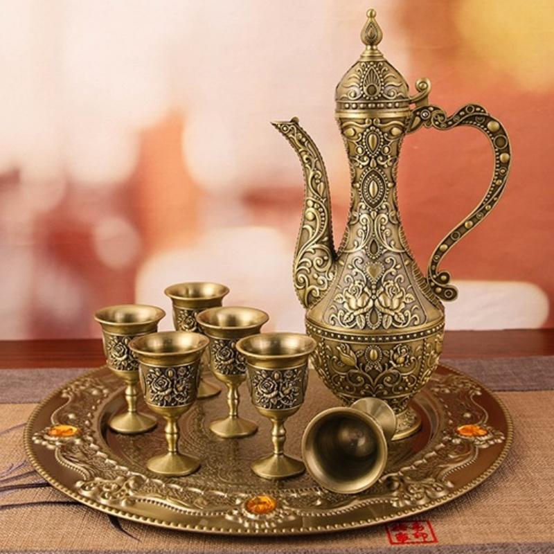 Exquisite Vintage Wine Glass, European Wine Set, Alloy Home Wine Pot Wine Glass Set, Creative Home Living Room Decoration,1Set