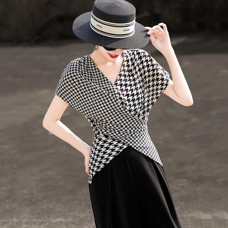 Lanser Women's French Retro Houndstooth Asymmetric V-neck Tie Shirt