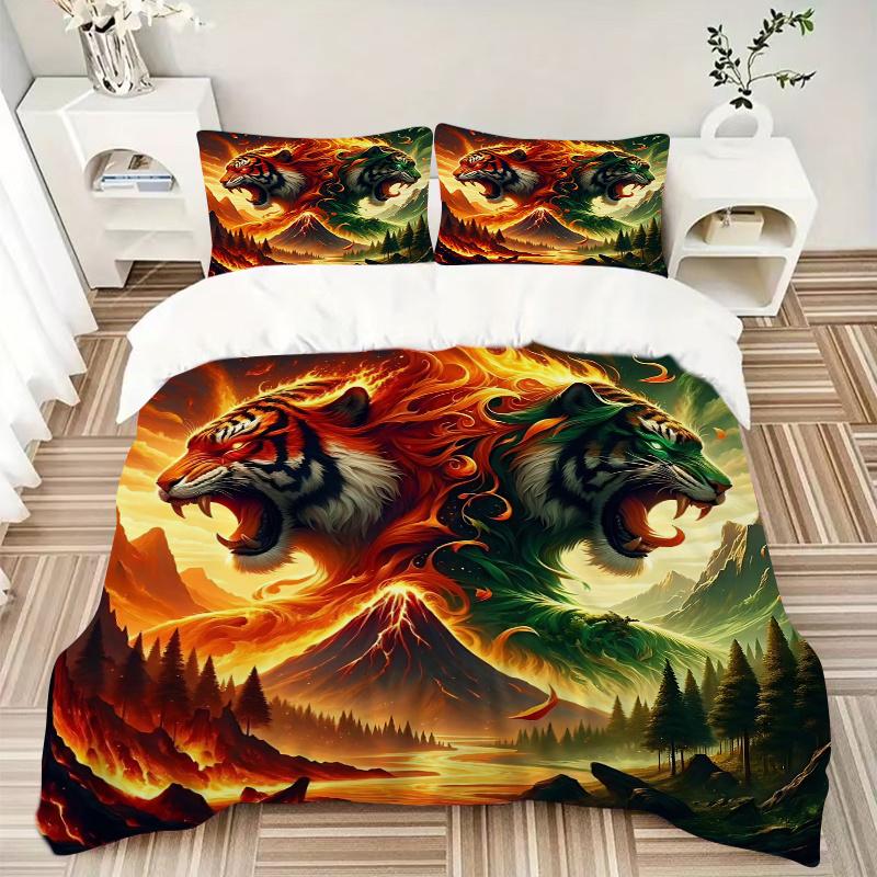 3pcs Flaming and Verdant Tiger Printed Duvet Cover Set (1 * Cover+2 * Pillowcase, Without Core), Suitable for Home Bedroom,