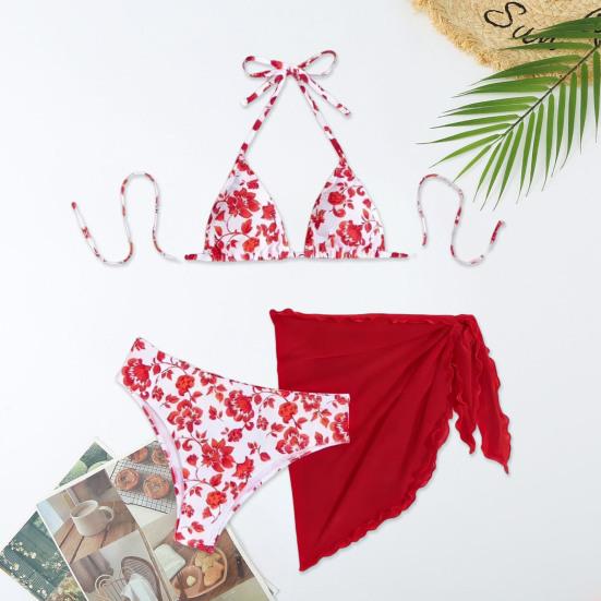 3Pcs/Set Swimsuit Set Halter Chest Pads No Underwire Bra Swimming Briefs Sheer Trim Cover Up Skirt Set Floral Print Split Swimsuit