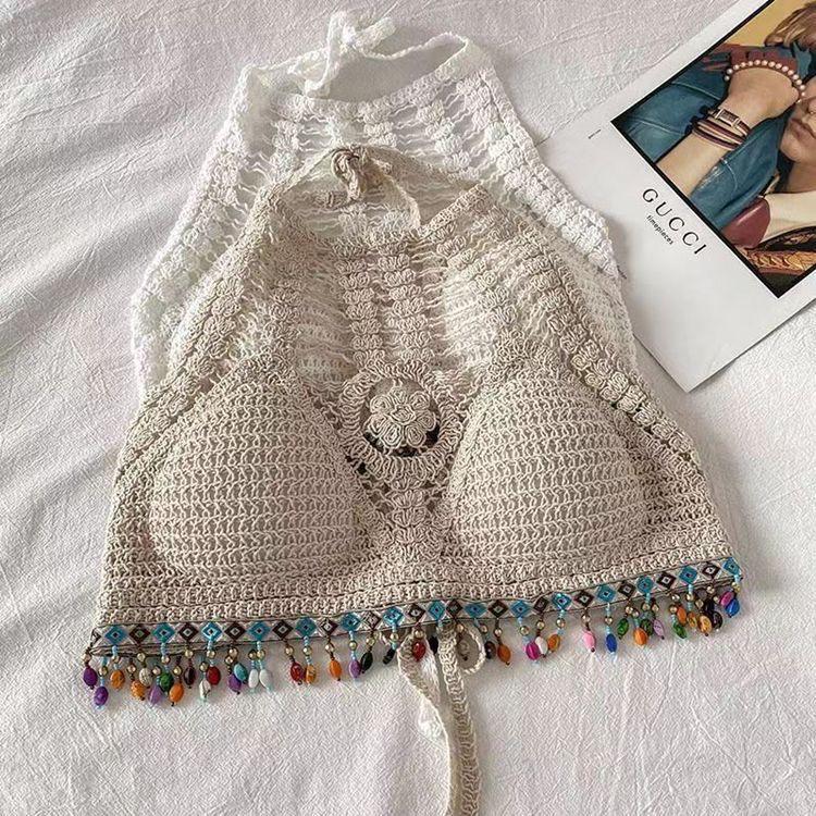 Bohemian Hollow Out Backless Halter Crop Top - Women's Sleeveless Summer Beach Camisole