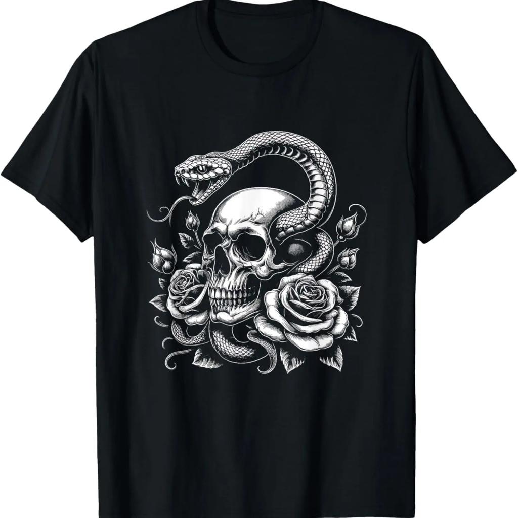 Skull Snake Graphic Roses Flower Art Design T-Shirt