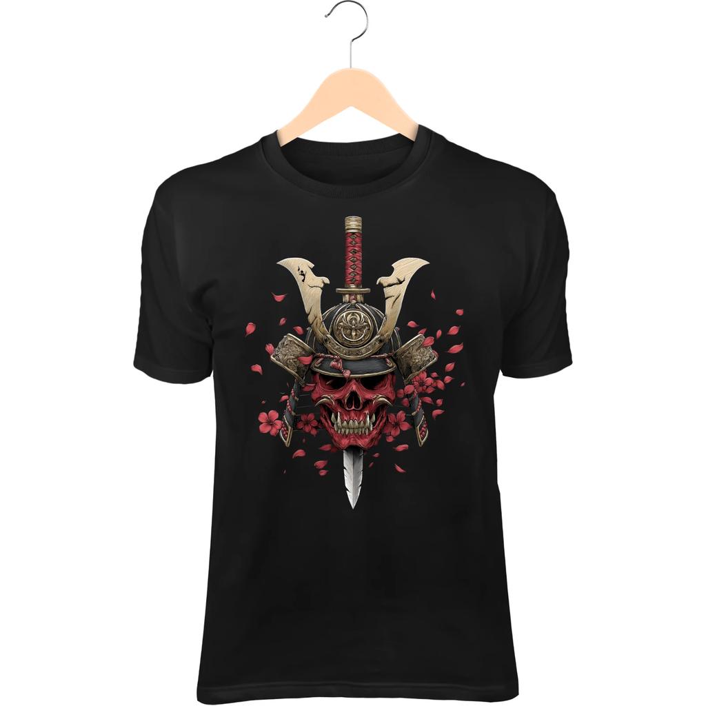 Skull Samurai T-Shirt – Cracked Red Mask, Raised Katana, Warrior Spirit