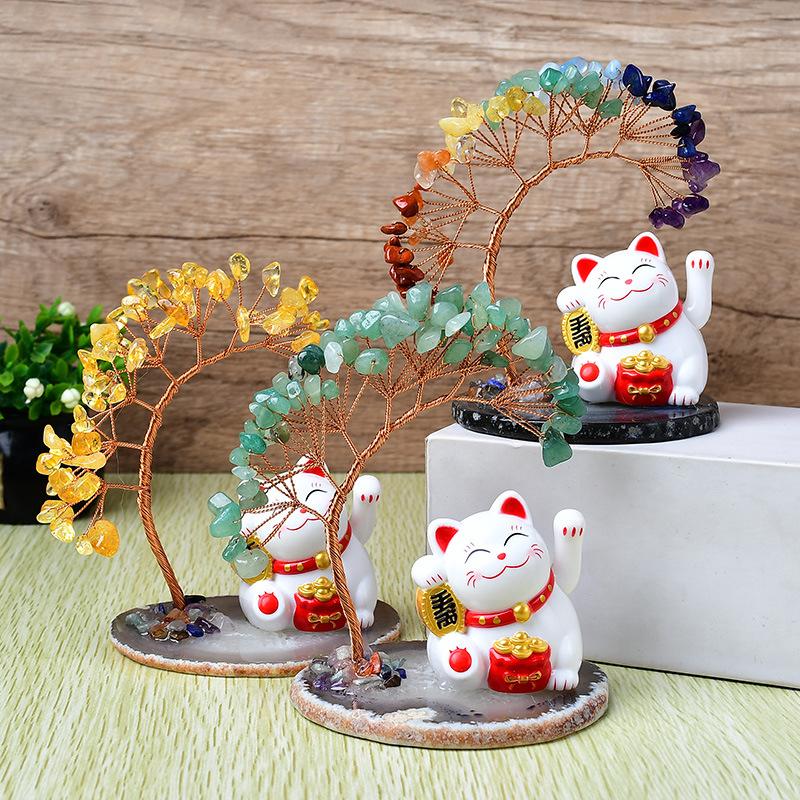 Solar Energy Shake Hands Lucky Cat Base Fate Tree Office Home Natural Crystal Crushed Stone Life Tree Handwoven Weaving Decor