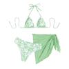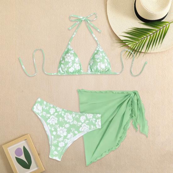 3Pcs/Set Swimsuit Set Halter Chest Pads No Underwire Bra Swimming Briefs Sheer Trim Cover Up Skirt Set Floral Print Split Swimsuit
