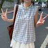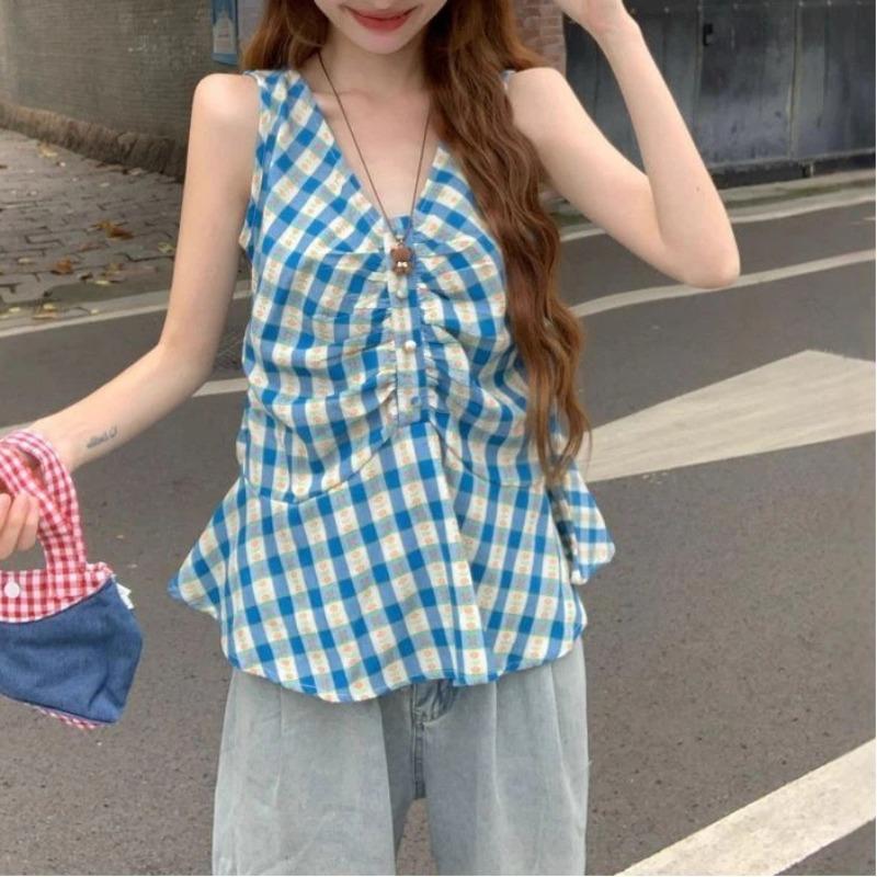 Summer New Women's Plaid V-neck Sleeveless Vest Ruffle Pleated Top