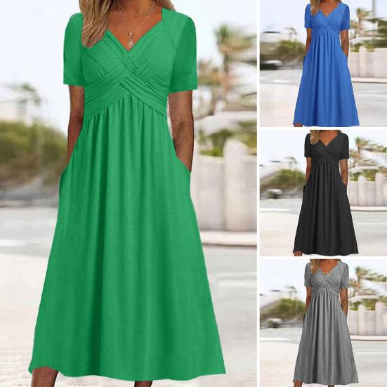 Dámské letní šaty Plisovaný pásek s křížem, výstřih do V Krátké rukávy Čistá barva Kapsy A-Line Volný lem Prodyšný Měkký Midi Šaty na dojíždění
