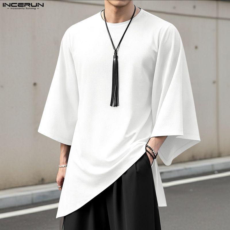 INCERUN Oversized Summer Men O Neck 3/4 Sleeve iIrregular Casual Long T-shirts Tee Tops