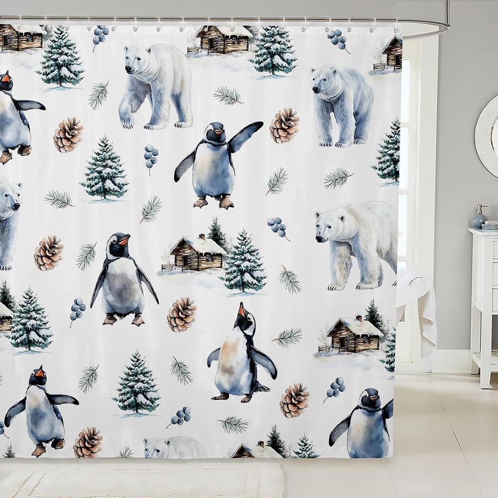 Erosebridal Penguin Polar Bear Shower Curtain,Rustic Cabin Lodge Kids' Shower Accessories,Kawaii Polar Animal Bathroom Shower Cu