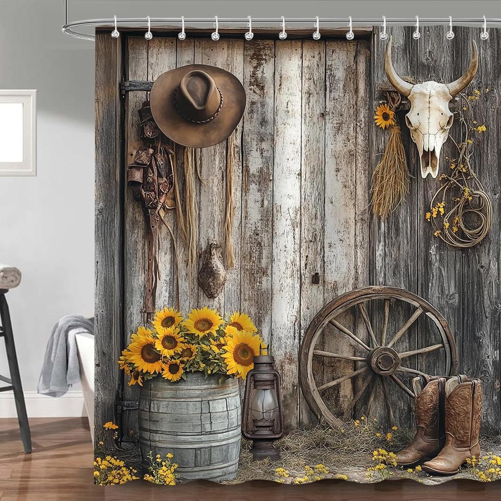 Western Farmhouse Shower Curtain fo Bathroom, Barn Door Rustic Southwestern Cow Skull Floral Bath Curtains Set, Polyester Fabric