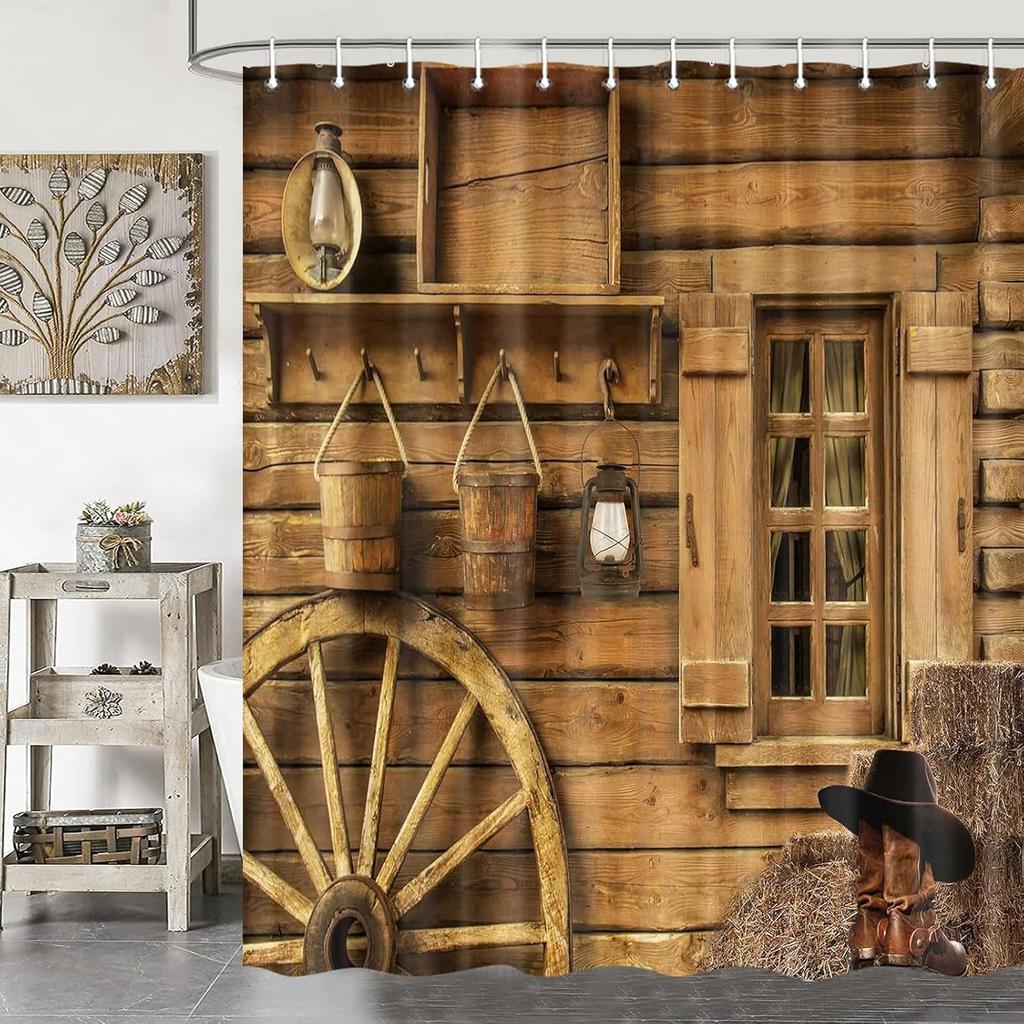 Rustic Western Barn Door Shower Curtains,Cowboy Hat Boot Farmhouse Decor Curtain Sets for Bathroom, Fabric Waterproof Vintage Wo