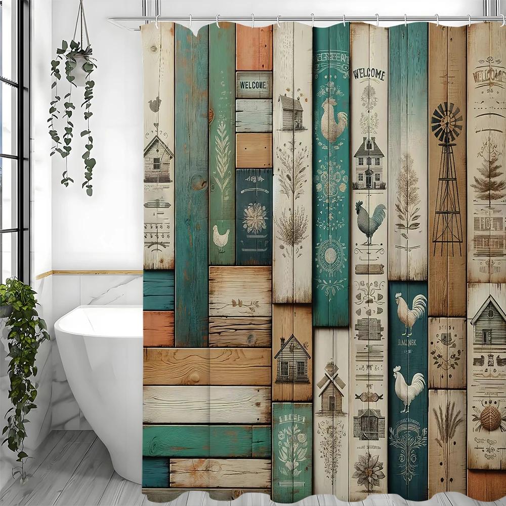 Rustic Theme Faux Wooden Paneled Chicken House Tree Shower Curtain, Bathroom Decorative Shower Curtain, Waterproof Shower Curtai