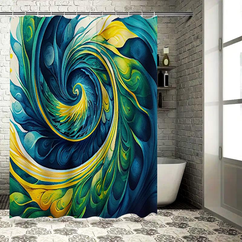 100% waterproof shower curtain made from water-resistant fabric for bathroom decor swirl print with blue, yellow, green colors