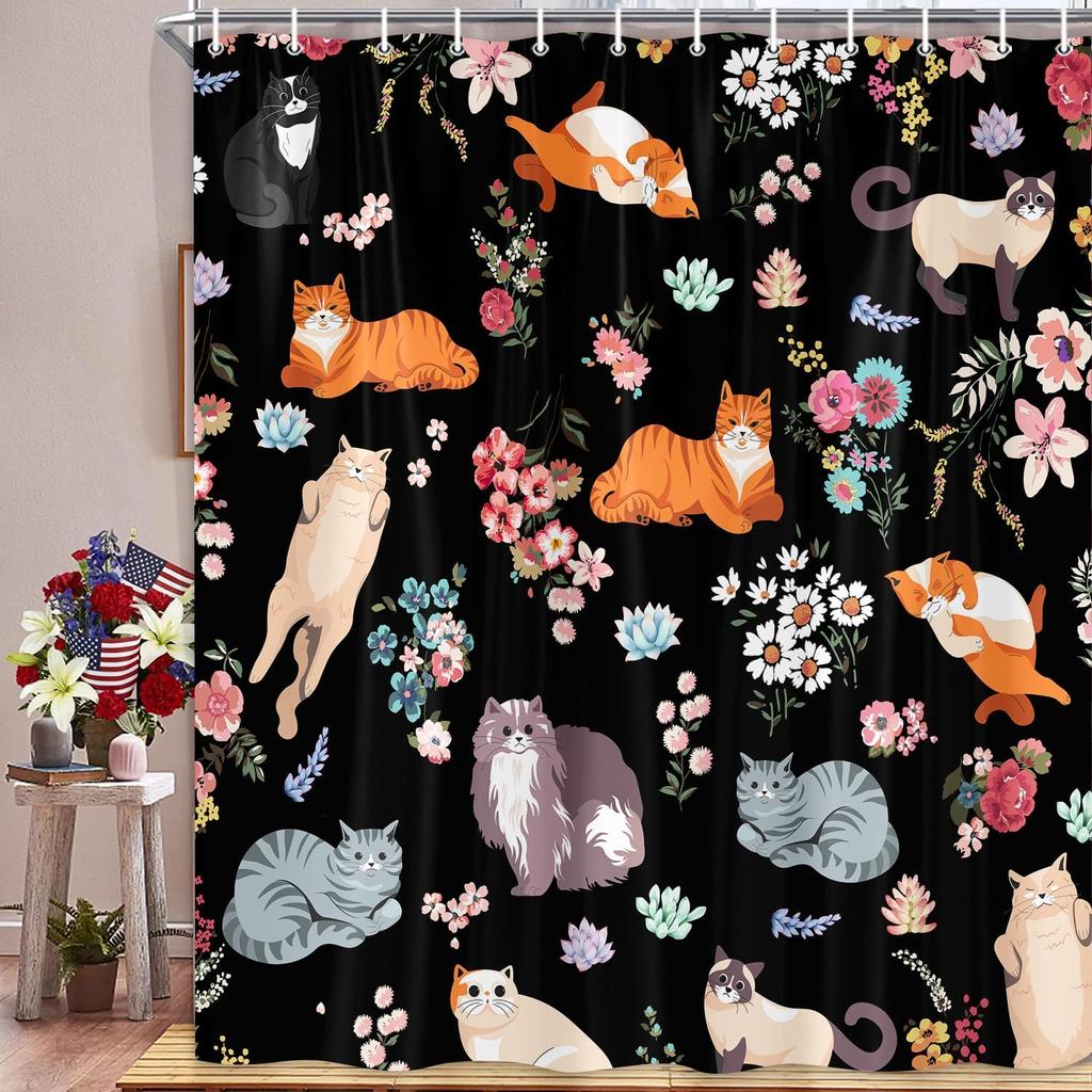 Cat Shower Curtain Black Cute Funny Floral Kitten Boho Bathroom Shower Curtain White Daisies Roses Cat Funny Shower Curtains