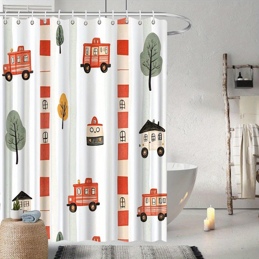 Whimsical Fire Truck Shower Curtain, Red & Green Stripes with Cartoon Trucks & Trees, Fade-Resistant Polyester, Fun Bath Decor