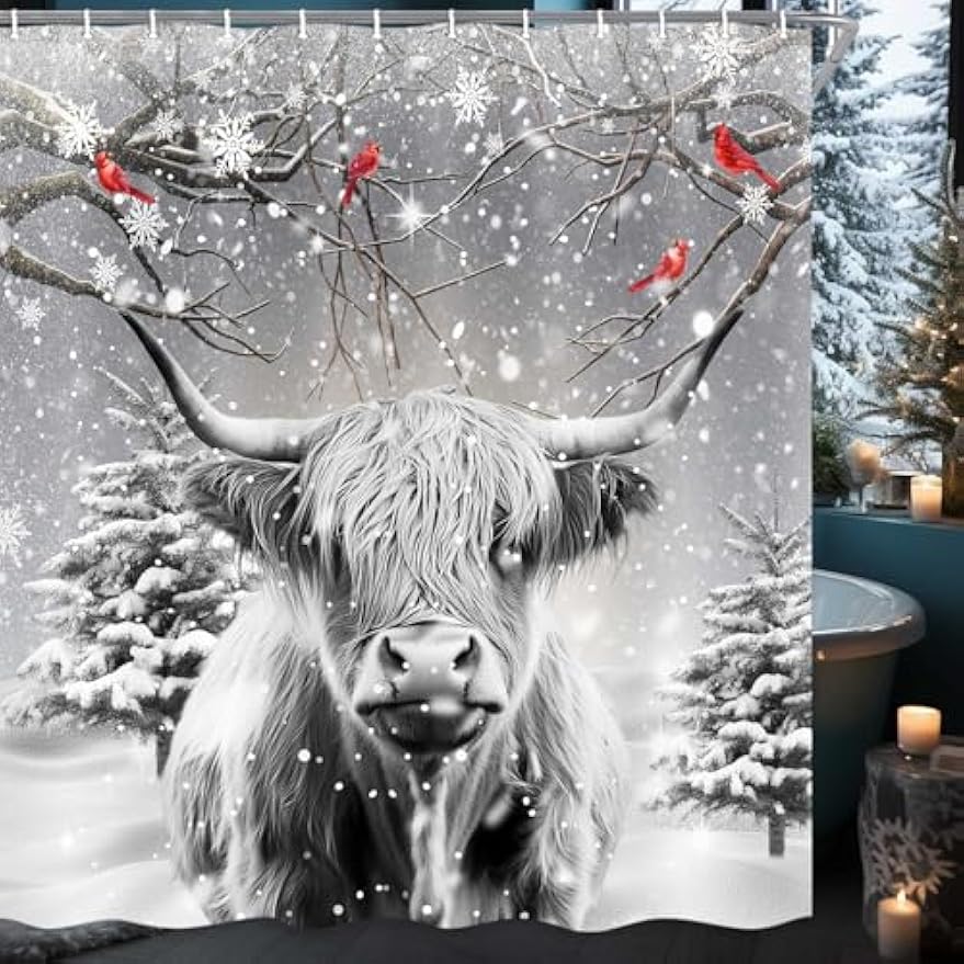 Christmas Shower Curtain Set, Farmhouse Funny Western Cow Fabric Shower Curtains, Merry Christmas Winter Forest Snow Pine Tree