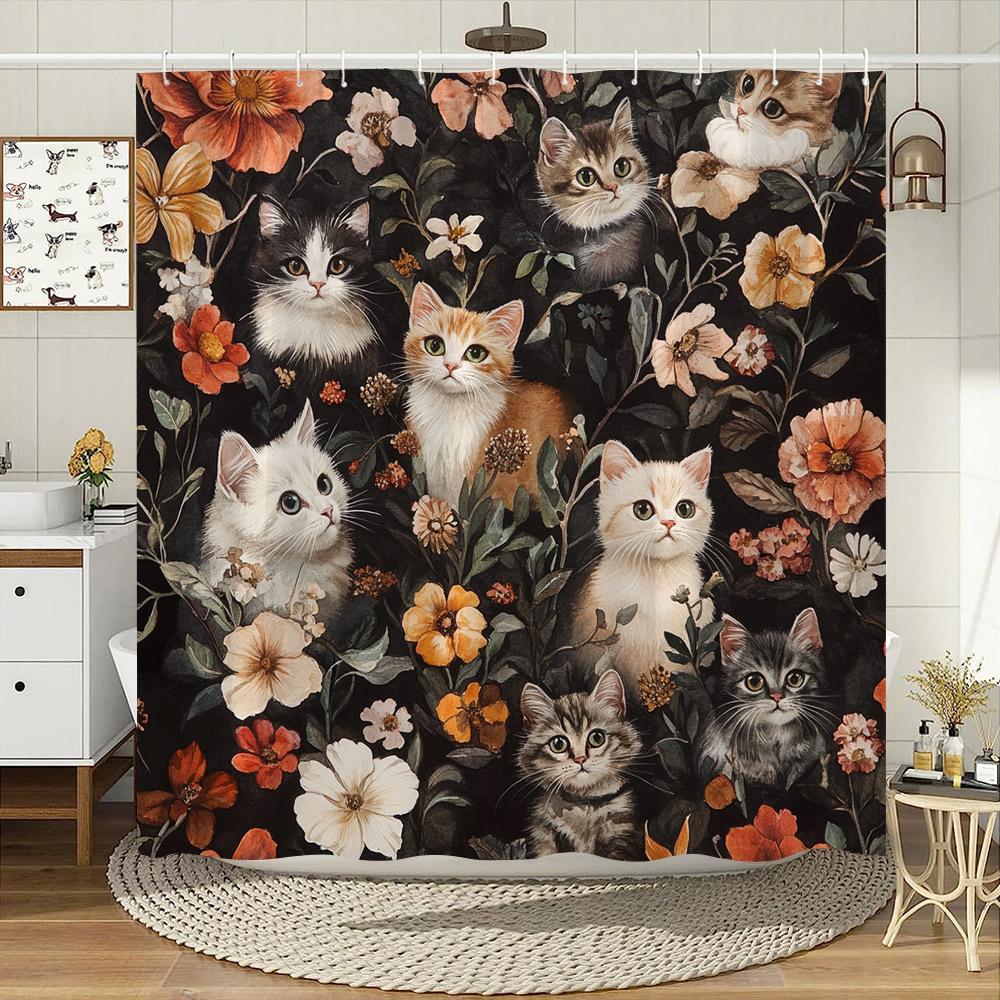 Vintage Style Cute Cat Shower Curtain Watercolour Blooming Flowers Polyester Fabric Home Bath Curtains Bathroom Decor with Hooks