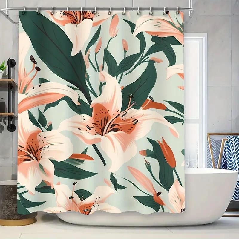 Botanical pink and Orange Lilies Waterproof Shower Curtain-Lush Green Leaves Soft Gradient, Modern Bathroom Decor