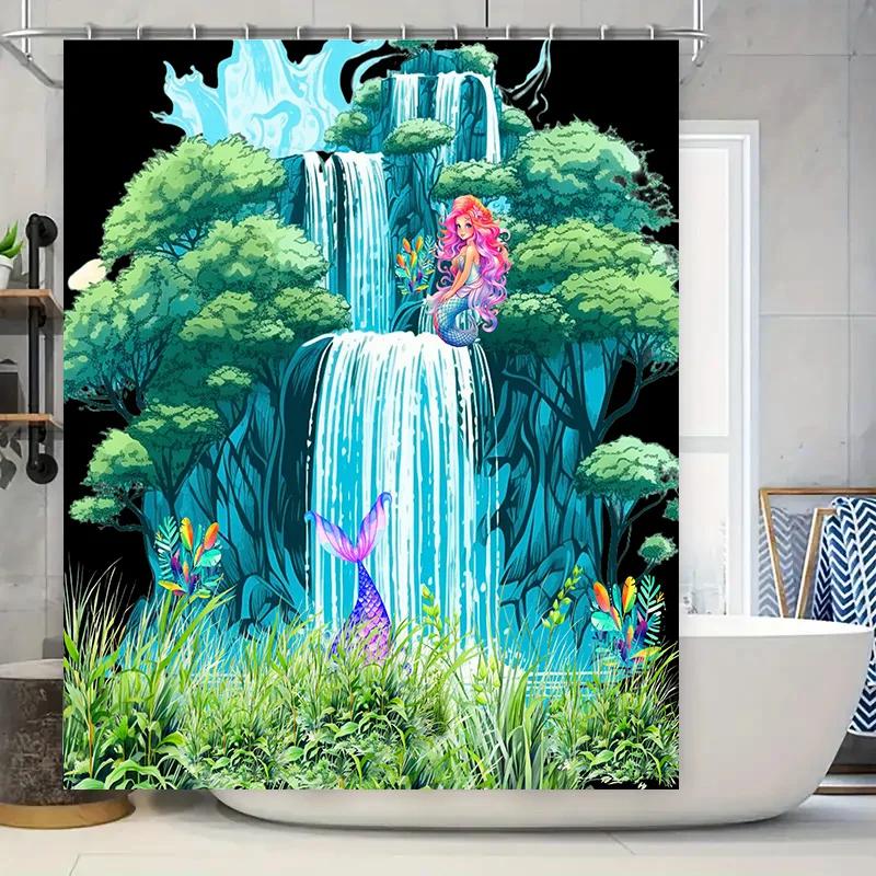 Colorful Mermaid Shower Curtain Waterfall Bathroom Decor with Tropical Plants