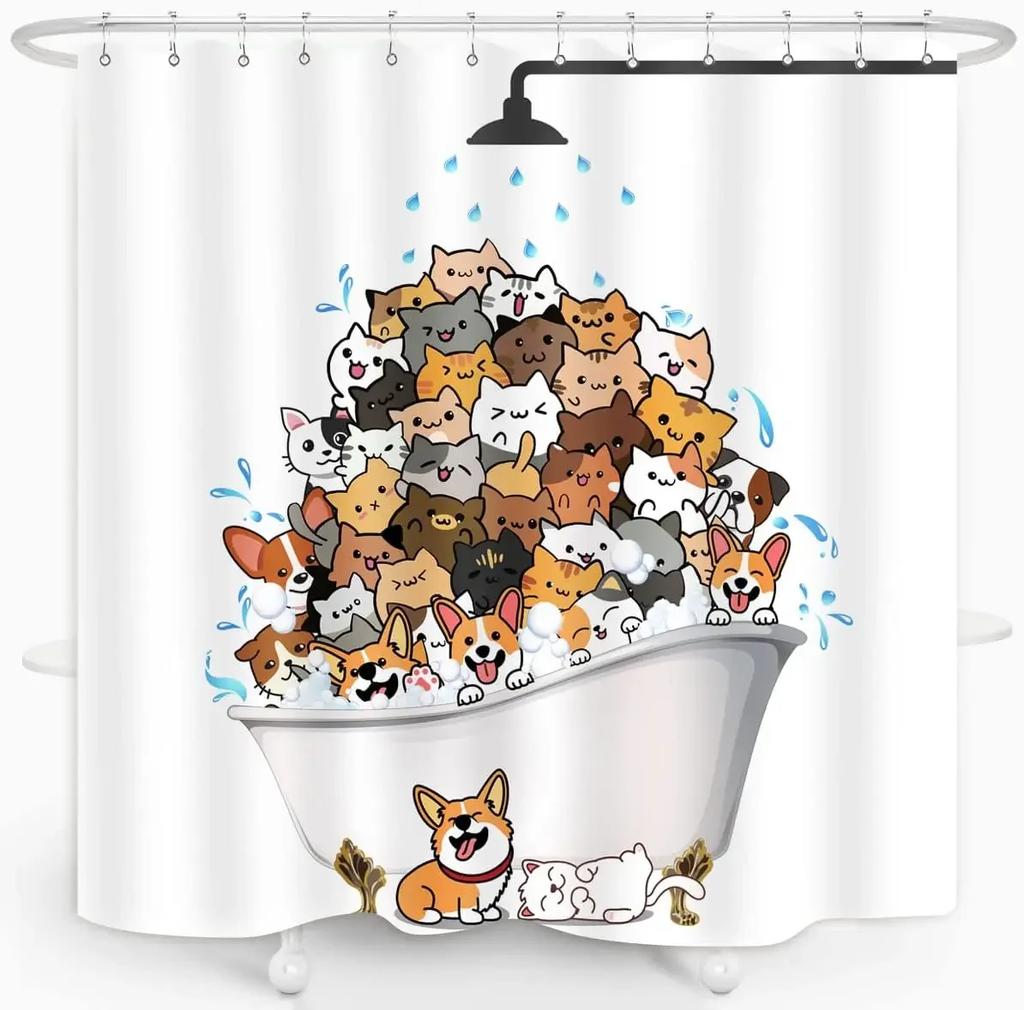 Cats and Dogs Shower Curtain Funny Cartoon Corgi Cute Animal Pets in Bathtub Showering for Kids Polyester Fabric Plastic Hooks