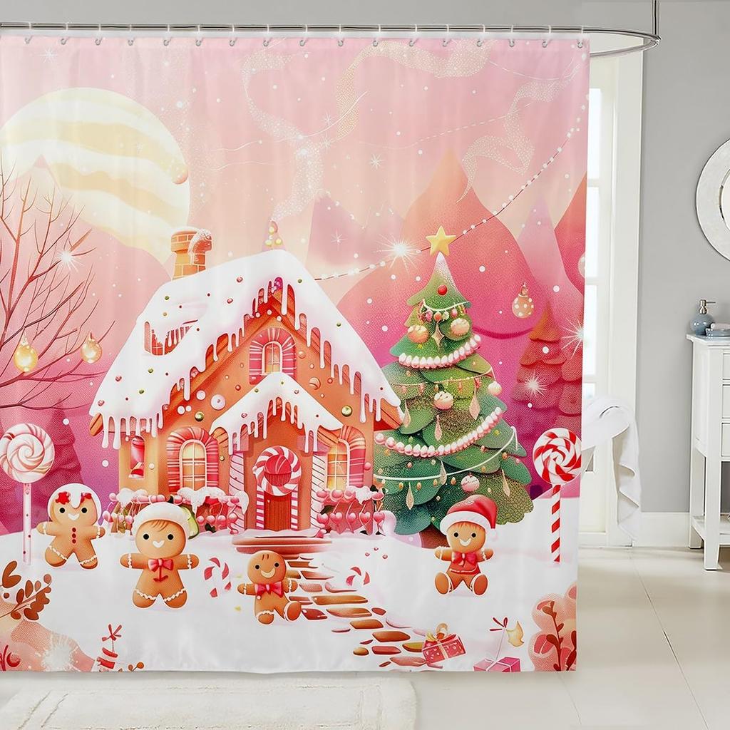 Christmas Gingerbread House Shower Curtain with Xmas Tree Snowflake Pattern, Waterproof Winter Bathroom Decor for Holiday Season