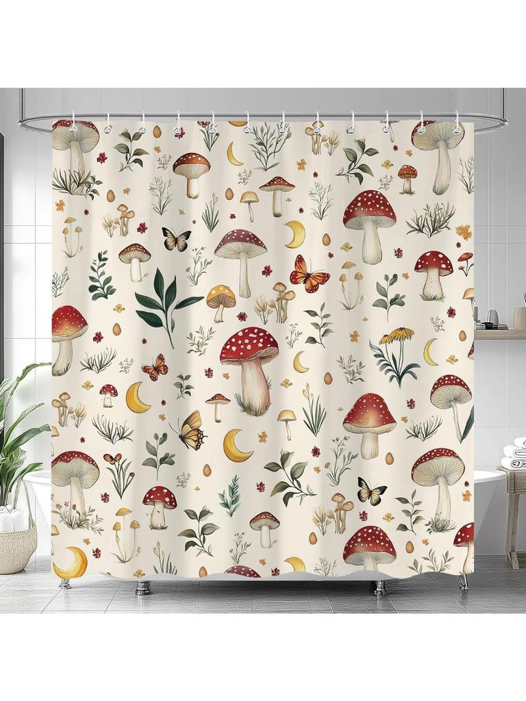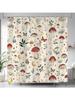 Mushroom Shower Curtain, Cute Funny Nature Botanical Plant Design Bath Curtains for Bathroom, Vintage Flower Butterfly Beige