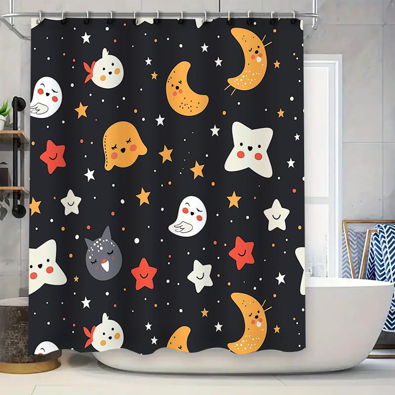 Charmful Night Sky Shower Curtain with Cartoon Characters Black Background Printed Fabric Waterproof Bathroom Decor for Kids Roo