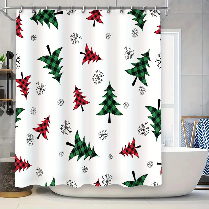 Festive Christmas Decor Shower Curtain Red Green Plaid Holiday Tree Pattern Printed Bath Linen Decoration Waterproof Washable H